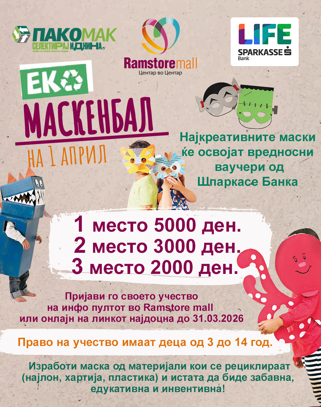 Разбудете ја креативноста на вашите најмили, подигнете ја еколошката свест, забавувајте се при изработката на маските, бидете наградени за вашата креативност и иновативност и дојдете на незаборавно дружење на 1 април во Рамстор Мол!